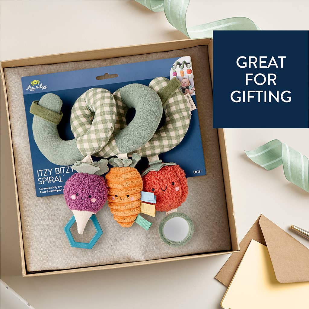 Endless adventures await with your babe’s new travel tagalong, the Itzy Bitzy Spiral™. Watch as your babe reaches for the dangling ring, smiles at their reflection in the hanging mirror, and grasps for the ribbons. Our natural cotton and soft velour fabrics are gentle to baby’s touch. For the many travels ahead, easily attach the Itzy Bitzy Spiral™ to your car seat and stroller for fun on-the-go!